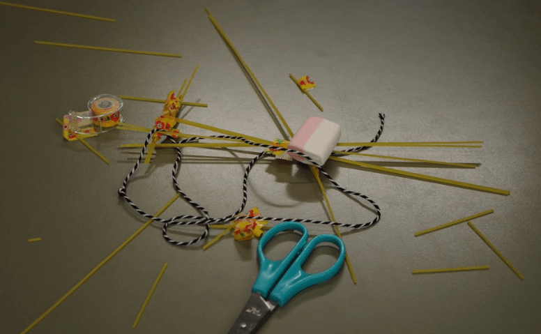 Onze eerstejaars zijn nog maar 9 weken in het hoger onderwijs bezig als ze de uitdaging aangaan. Elk team moet in 18 minuten een toren bouwen die volledig op zichzelf staat. Het materiaal bestaat uit 20 staafjes ongekookte spaghetti, 1 meter dun touw, 1 meter plakband, een schaar en … een marshmallow. Die moet na afloop bovenop de toren prijken. Het team met de hoogste toren wint.