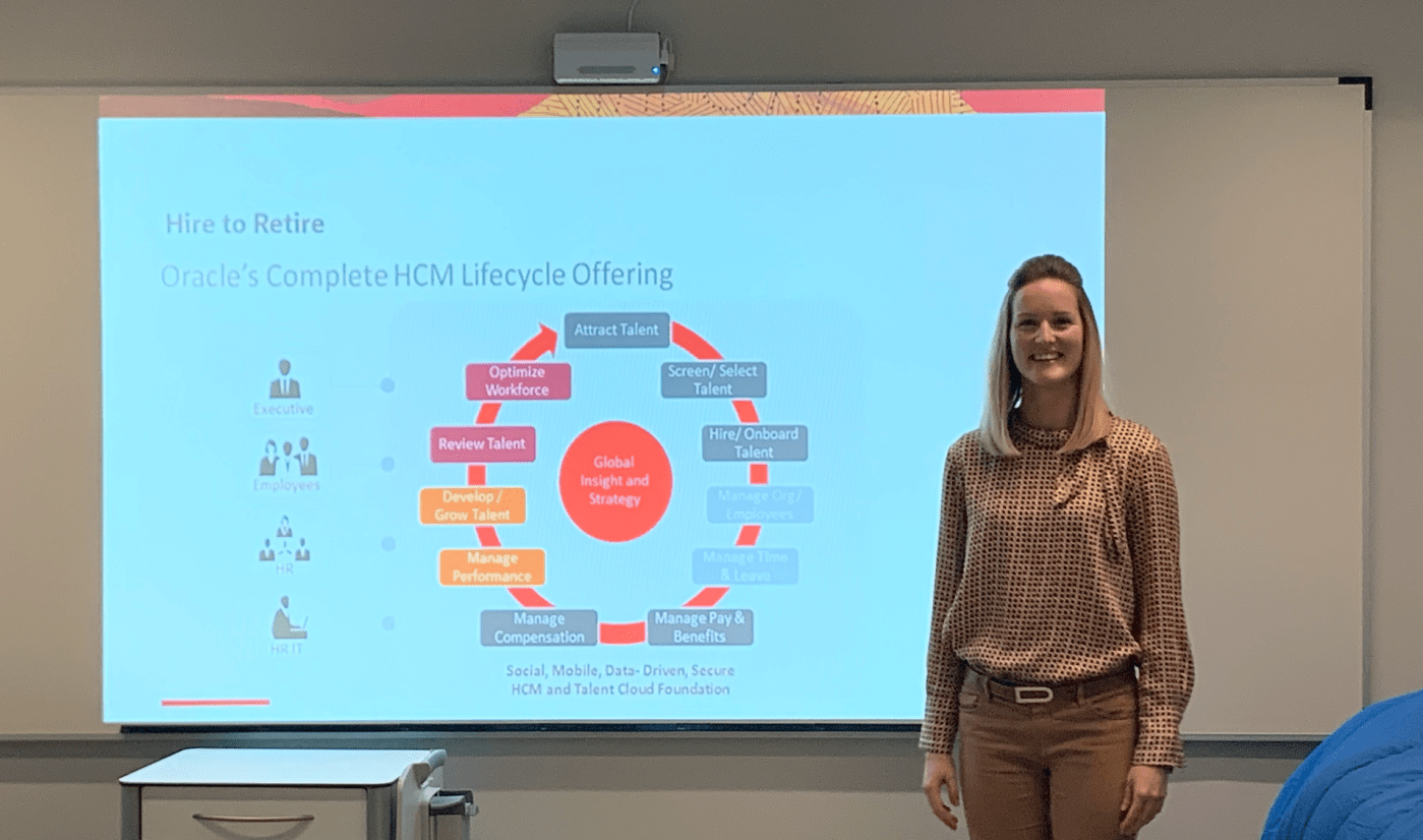 Als student in Office Management is het ons alvast duidelijk: gastcolleges en sprekers zijn een kans om verbinding te maken met het werkveld. Zo kregen we recent de kans in het vak HRM-Topics van HR-docent Ann Foubert in contact te komen met het e-HRM-systeem van de firma Oracle. Hun medewerker Elke Devinck kwam dit met veel plezier uitleggen.