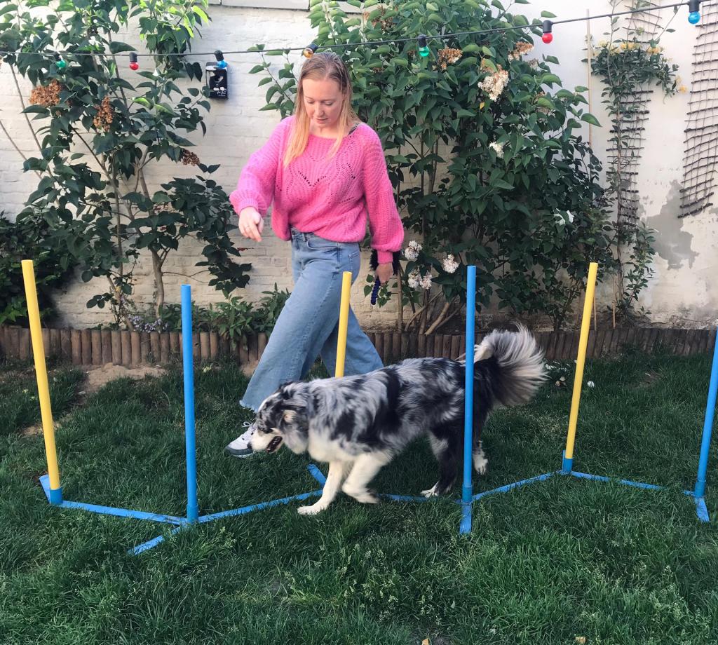 Vandaag ligt de focus op onze Border Collie Basiel. We starten met een stevige wandeling en een spurtje. We laten hem zelfs op omgevallen boomstammen klimmen. In de middag kregen we bericht dat volgende week de hondenschool weer opent. Hij zit eigenlijk in de “gevorderde agility”, maar is de laatste weken eerder getalenteerd in “gevorderd lui zijn”. Daarbovenop zien we in de agility Facebookgroep dat zijn streberige klasgenoten hard oefenen. We laten alles vallen en pakken onze weave vanonder het stof. Basiel, werken jongen!!