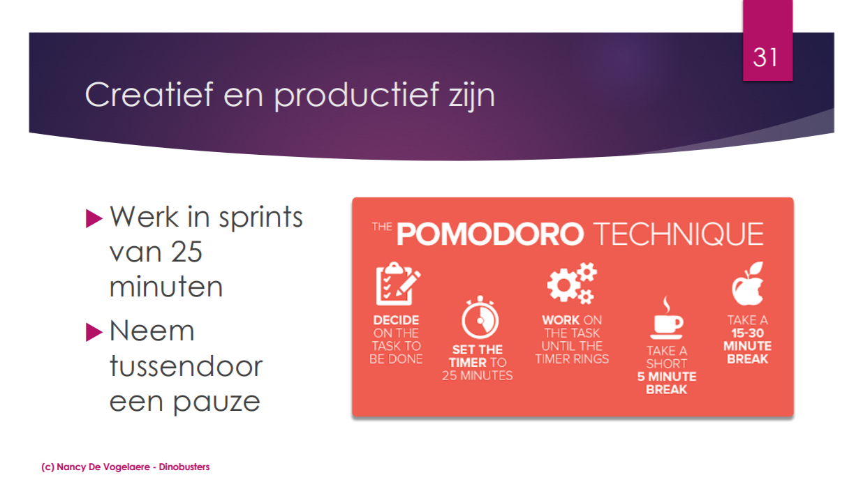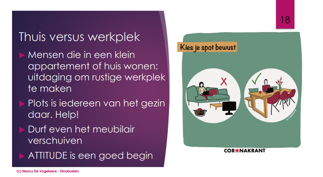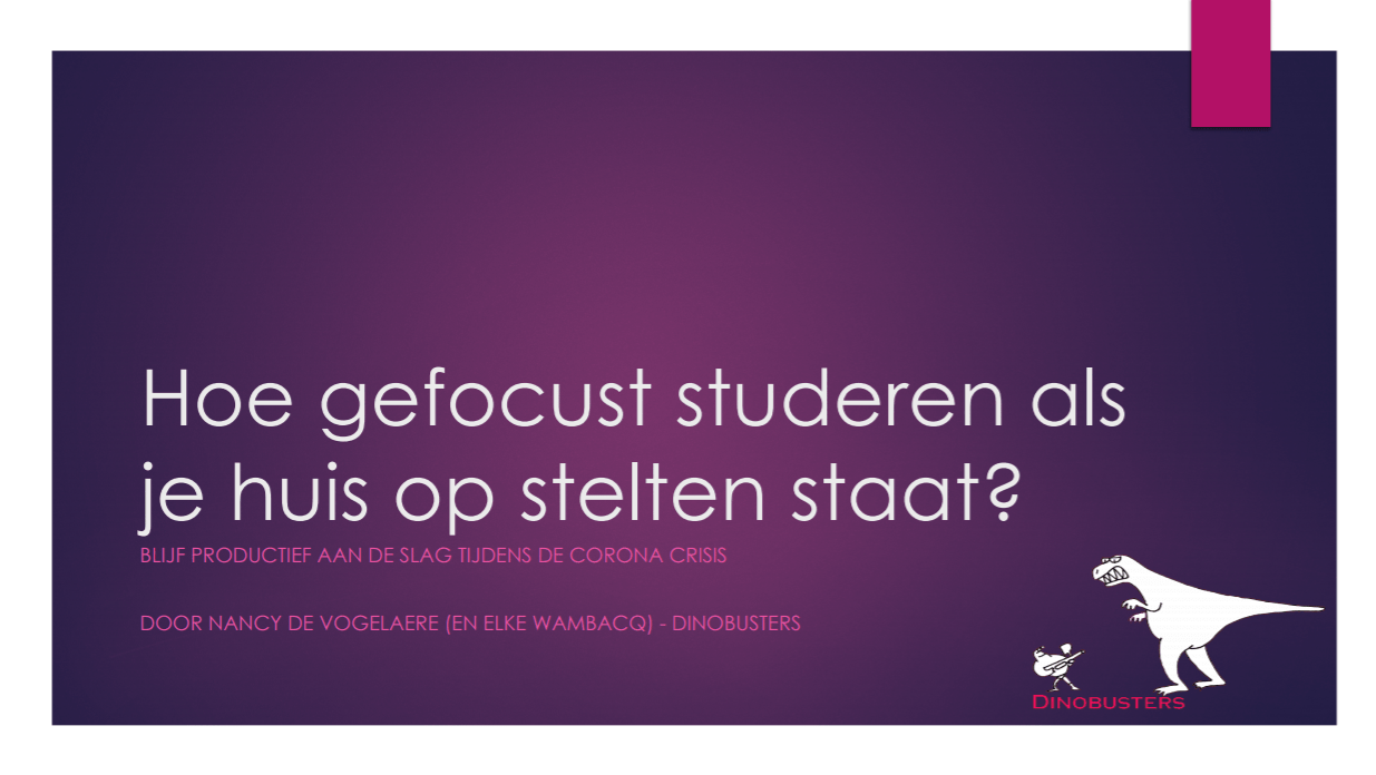 In deze vreemde tijden is thuis werken of studeren een hele uitdaging. Want hoe hou je nu je aandacht erbij? In het seminarie ‘Hoe gefocust studeren als je huis op stelten staat?’ gaf Nancy De Vogelaere ons tips en tricks.
