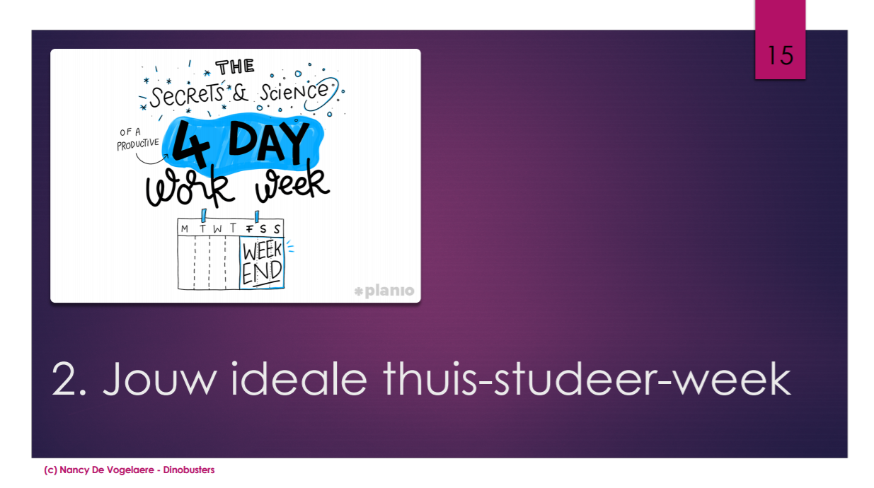 De volgende tip is: “deel je tijd in”. Hoe ziet jouw ideale werk-studeer-week-van-thuis uit eruit? Verdeel je week in 3 groepen: focus, flexibel en vrij. Op deze manier weet je waar je op welk moment aan toe bent.