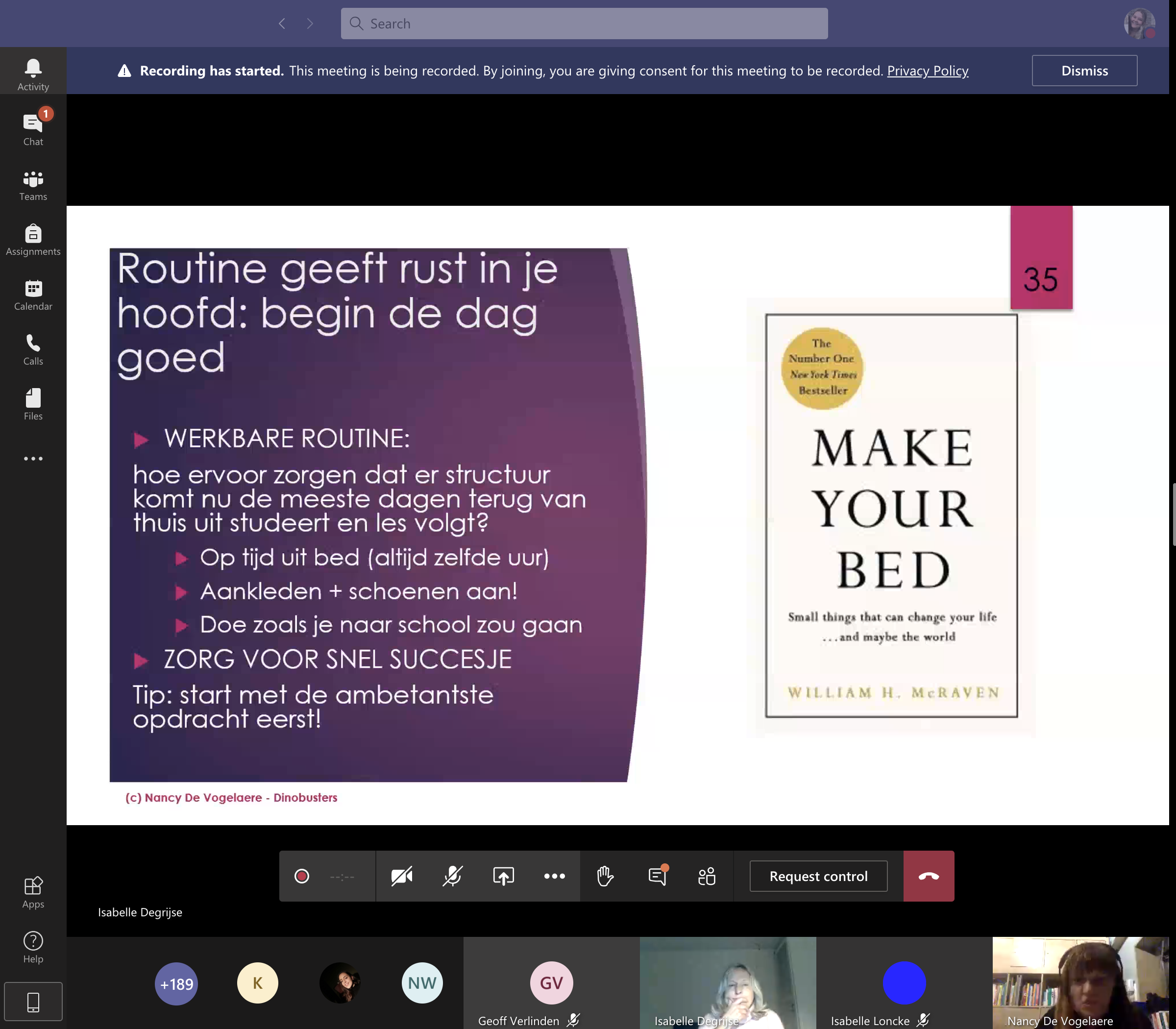 “De conclusie die ik uit dit seminarie kan trekken is kort en duidelijk: zorg goed voor jezelf! Zorg dat je jezelf voldoende rust en structuur biedt, maak duidelijke afspraken met huisgenoten en plan je tijd zorgvuldig in.”