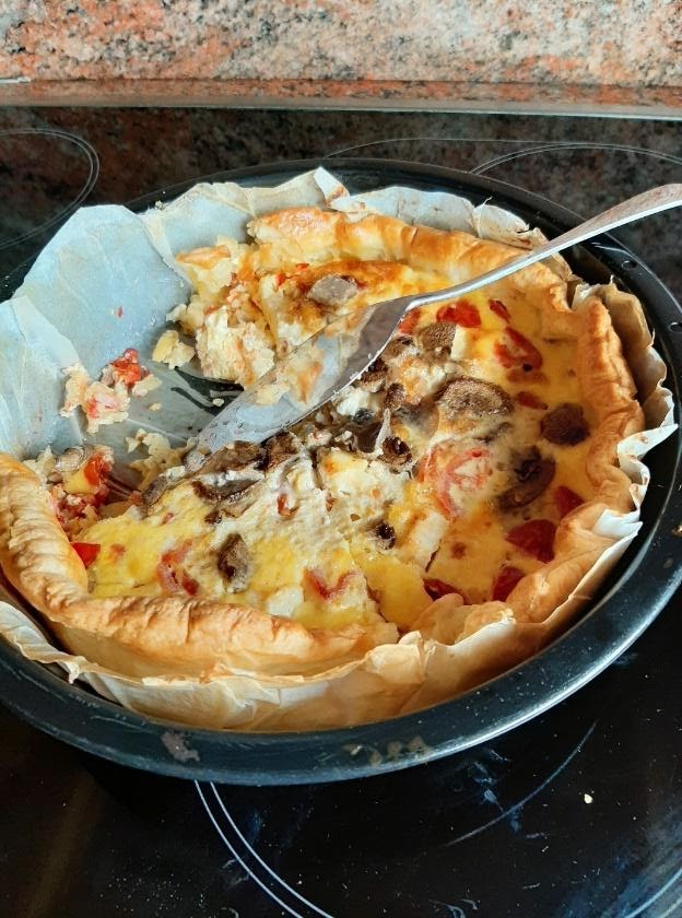 Daarna strooi je de ingrediënten met de geklopte eieren in de bakvorm. Plooi de rand van het bladerdeeg om en zet de quiche voor 20 à 25 minuten in de oven. Vanaf de quiche een goudbruine kleur heeft, is onze quiche klaar. Smakelijk!