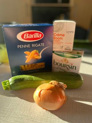 | Ingrediënten (voor 4 personen) 1 potje Boursin cuisine look en fijne kruiden €2.69 | 240gr 200 ml room €0.49 500 gr penne rigate €1.69 2 courgettes €1.65/kg 1 ajuin 1 teen look |