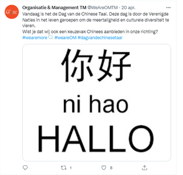 Met ons team proberen wij het twitterkanaal van Organisatie & Management te onderhouden. Wij proberen iedere week weer enkele leuke en interessante posts te bedenken en maken. De belangrijkste uitgangspunten voor ons zijn diversiteit, speciale dagen en “Spread the word”. We proberen ook zo veel mogelijk rekening te houden met diversiteit. Dit is natuurlijk omdat onze school bestaat uit allemaal unieke individuen en wij dit graag ook een beetje in de verf zetten!