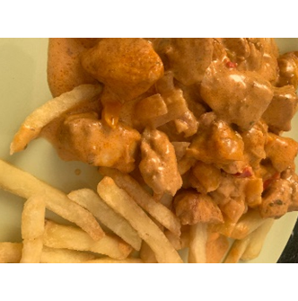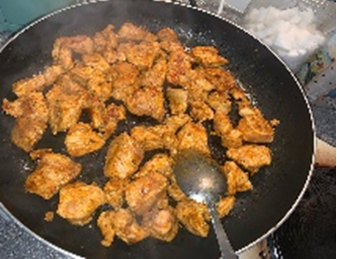 - Snij de kipfilet in blokjes en doe er kippenkruiden, ras el hanout, Cayennepeper, paprika, tijm, lookpoeder, zout en peper bij. *Kruiden is belangrijk 😊*