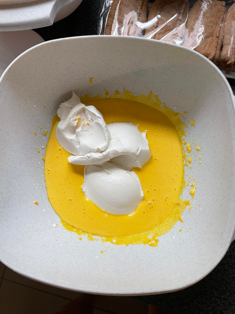 Stap 5: Klop de eiwitten op en schep deze zachtjes onder het mascarpone mengsel. Het is belangrijk dat je de lepel niet afklopt op de rand, want anders gaat de lucht uit de opgeklopte eiwitten.