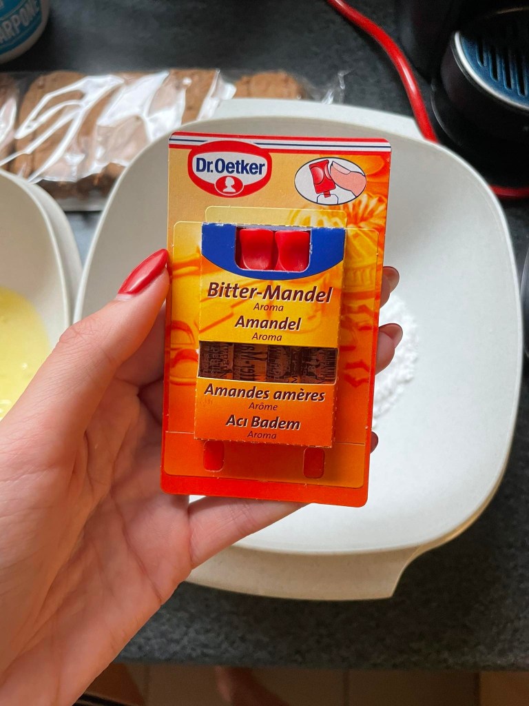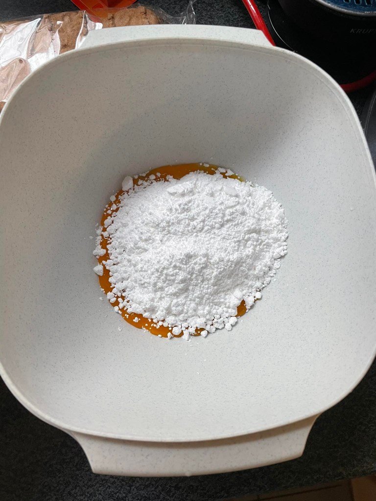 Stap 3: Meng met een mixer de 4 eierdooiers samen met de bloemsuiker en het amandelextract tot een luchtig beslag.