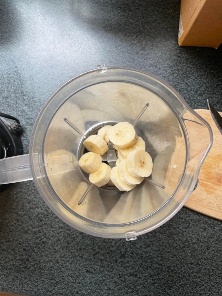 Stap 2: Snijd één banaan in stukjes en doe deze stukjes in de blender.