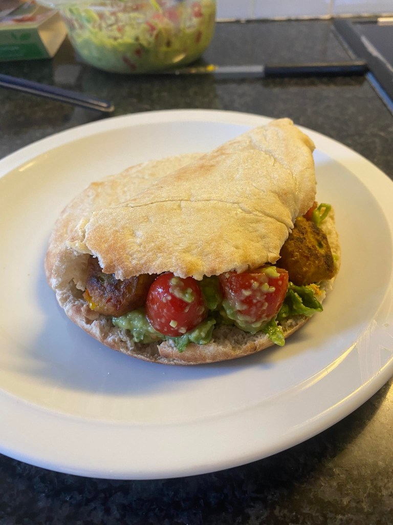 Gevuld pitabrood met guacamole, rucola, tomaten en groentenballetjes (2 per)
