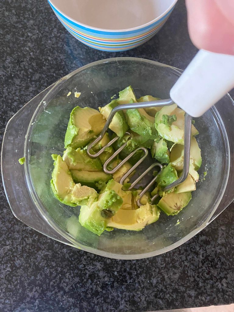 Stap 3: Pel de advocado’s, snij ze in stukken en plet ze met een stamper of vork in een kom