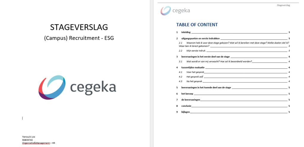 Mijn stage begon op 13 februari 2023 en zal eindigen op 19 mei 2023. Veertien weken waarin ik de kneepjes van het vak mag leren op de Recruitment afdeling van Cegeka. Ik loop mee op de (Campus) Recruitment afdeling en ook een deeltje bij Environmental Social Governance (ESG). ESG kunnen we vergelijken met Corporate Social Responsibility (CSR). Twee zeer interessante afdelingen waar ik mezelf later ook zeker zou zien werken.