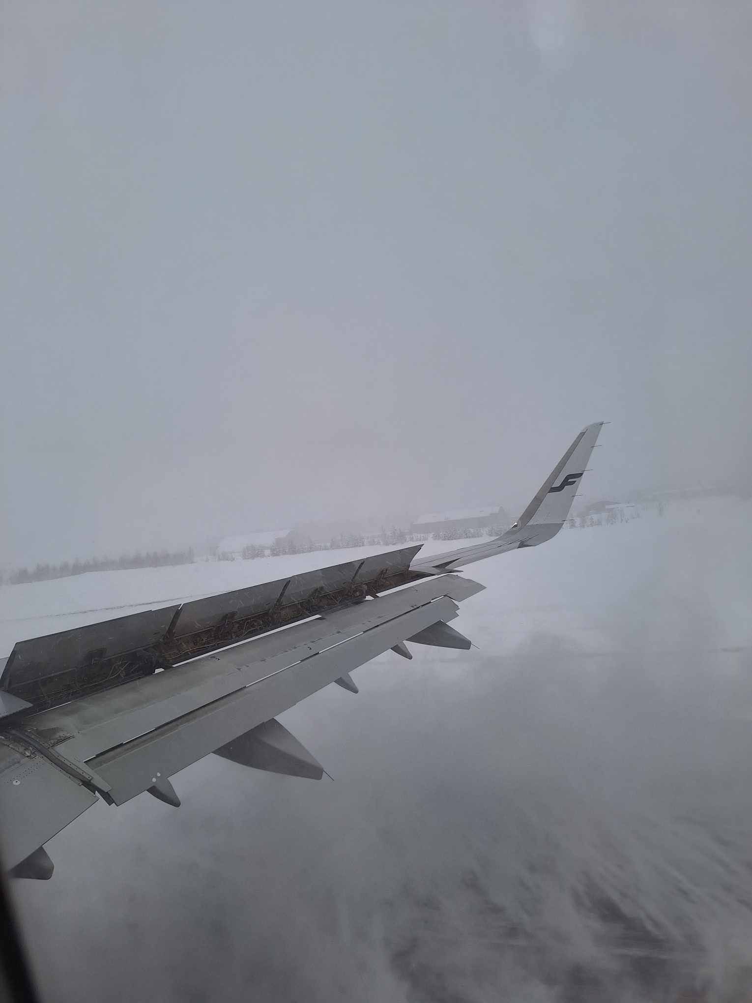 In de lucht zagen we alleen wolken, maar bij aankomst in Lapland was alles wit: de bergen, de bomen, de huizen. We landden op de landingsbaan tijdens een kleine sneeuwstorm.