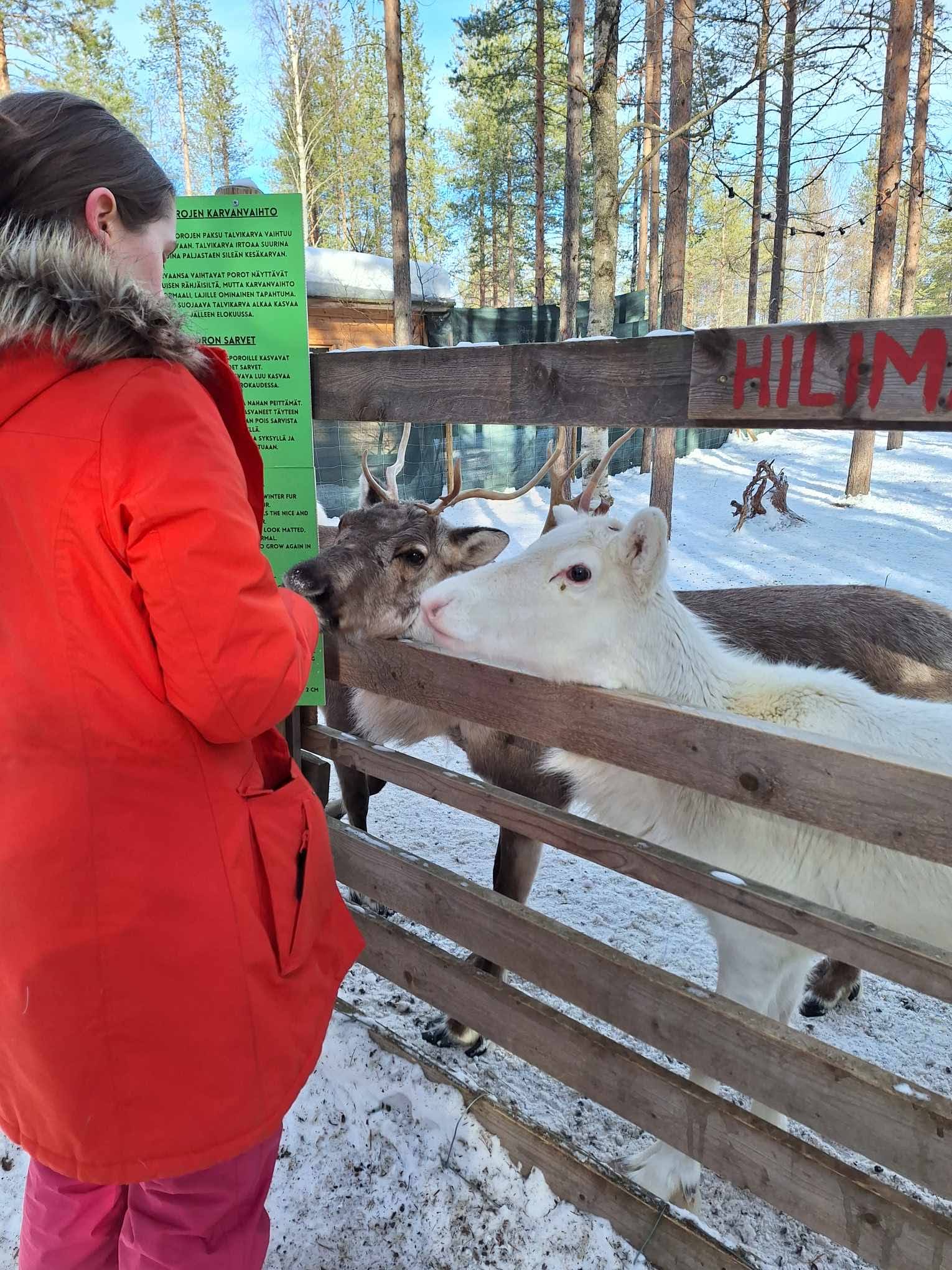 Daarna reden we naar “Santa Claus Village” voor een rendierrit. Gevolgd door een bezoek aan de “Elf’s Farmyard”. Op deze locatie konden we rendieren voederen en andere dieren aaien. Op de wandelwegen had je verschillende sneeuwglijbanen waar je met een slee vanaf kon glijden. Deze haalden het kleine kindje in ons naar boven. 🙂