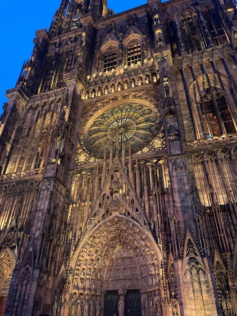 Toen we weer in Straatsburg waren, hebben we nog een korte stadswandeling gedaan. Ook kregen we nog wat kunstgeschiedenis van onze befaamde gids, Martine. Jammer genoeg zijn we niet binnen in de kathedraal kunnen komen. We moesten namelijk vertrekken naar Obernai waar een wijnproeverij op ons stond te wachten.